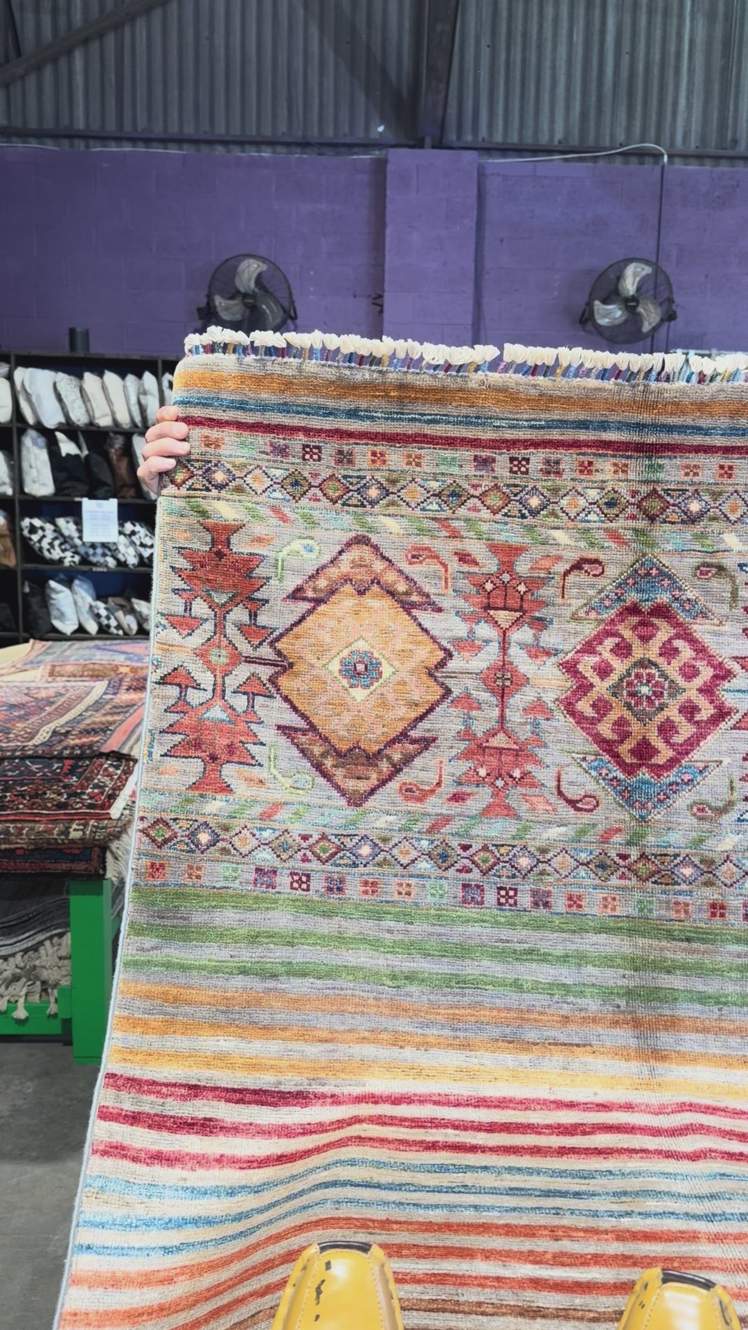 A Khorjin rug is a type of hand-knotted tribal rug inspired by the designs of khorjin, which are double-sided bags used by nomadic tribes in the Middle East and Central Asia. These rugs are known for their vibrant, geometric patterns, use of natural or vegetable dyes, and construction from hand-spun wool. They come in various shapes, including area rugs and runners, and are prized for their durability and cultural storytelling.