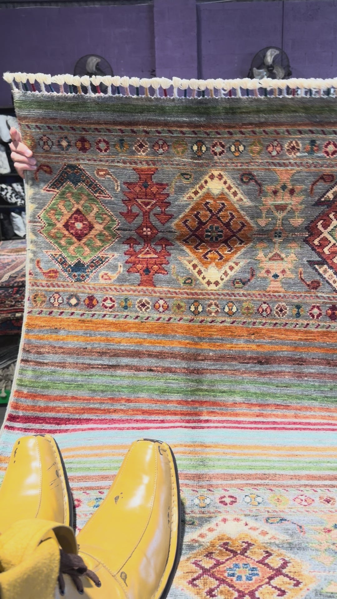 A Khorjin rug is a type of hand-knotted tribal rug inspired by the designs of khorjin, which are double-sided bags used by nomadic tribes in the Middle East and Central Asia. These rugs are known for their vibrant, geometric patterns, use of natural or vegetable dyes, and construction from hand-spun wool. They come in various shapes, including area rugs and runners, and are prized for their durability and cultural storytelling.
