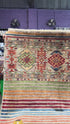 A Khorjin rug is a type of hand-knotted tribal rug inspired by the designs of khorjin, which are double-sided bags used by nomadic tribes in the Middle East and Central Asia. These rugs are known for their vibrant, geometric patterns, use of natural or vegetable dyes, and construction from hand-spun wool. They come in various shapes, including area rugs and runners, and are prized for their durability and cultural storytelling.
